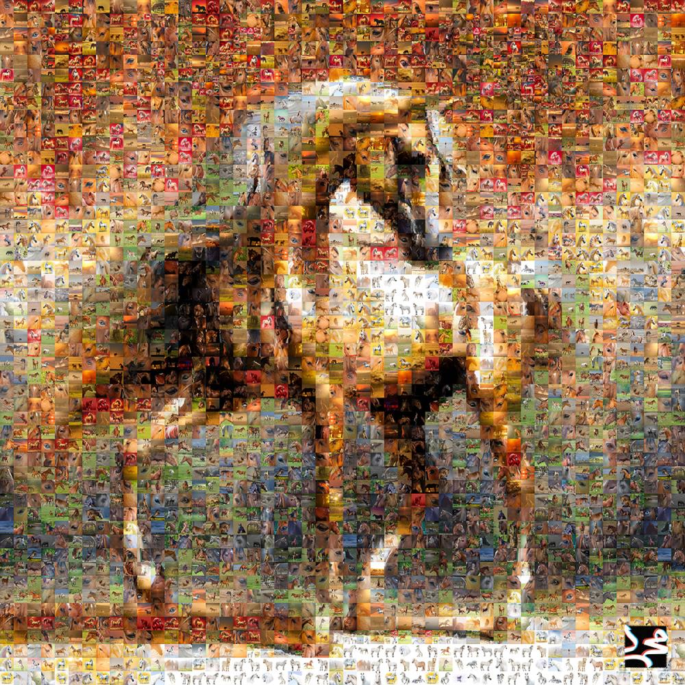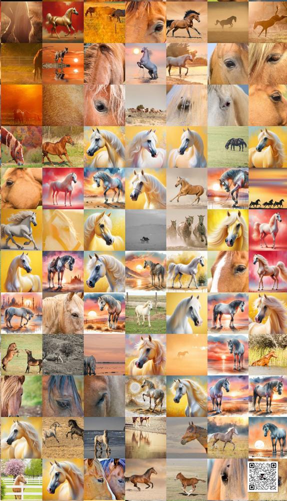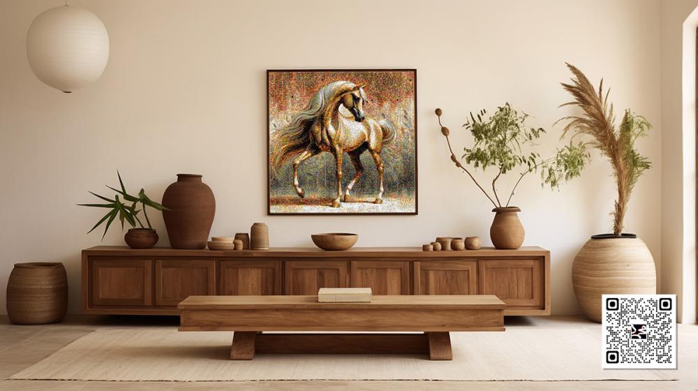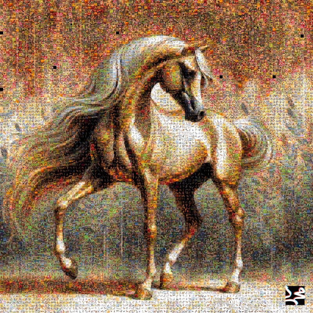 المحتوى الفني: بورتريه فني لفرس عربية تتميز بعرف (شعر عنق) طويل وكثيف ينساب بأناقة. التصميم منفذ بتقنية "الفسيفساء الرقمية"، حيث تتشكل تفاصيل الشعر والوجه من تجميع آلاف الصور الصغيرة (Micro-photos) المستوحاة من البيئة والتراث.